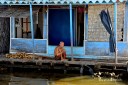 old men on the balconys of a floating house, Sangker River, Cambodia