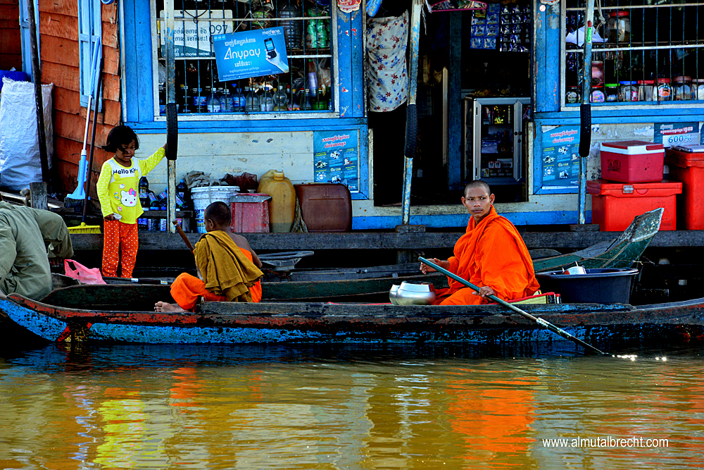 buddhist monks in a boat on the Sangker River, Cambodia