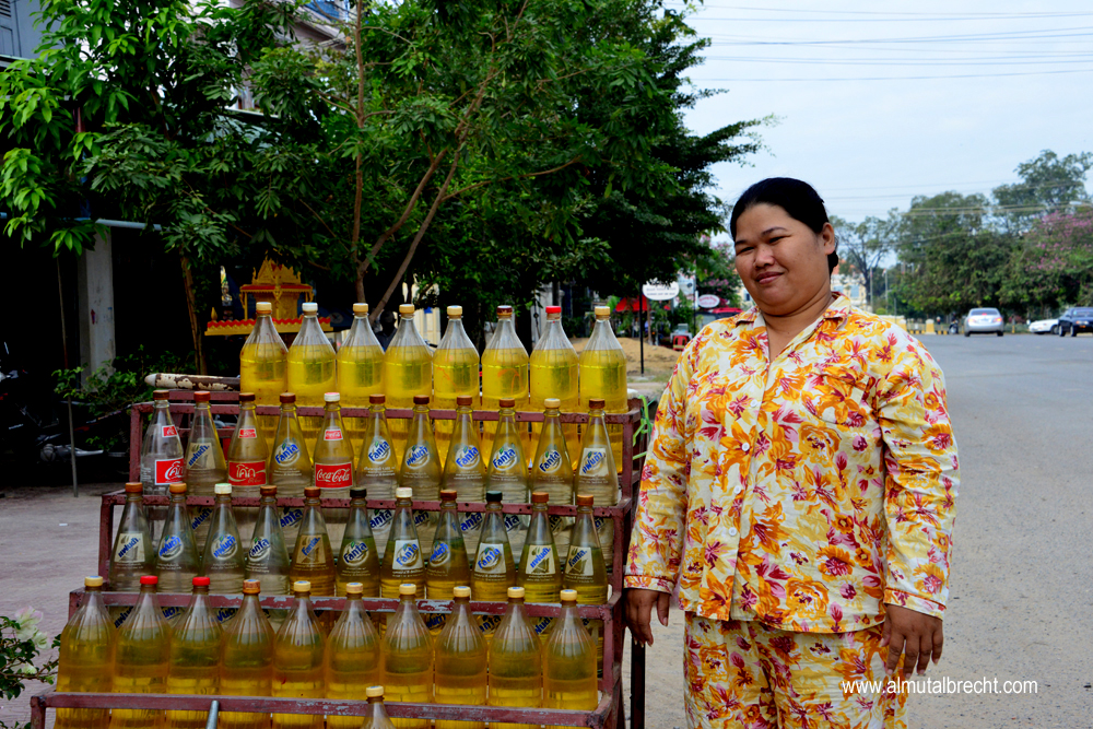 The cambodian woman in Pyamas sells petrol (gasoline) for mopeds on the street.