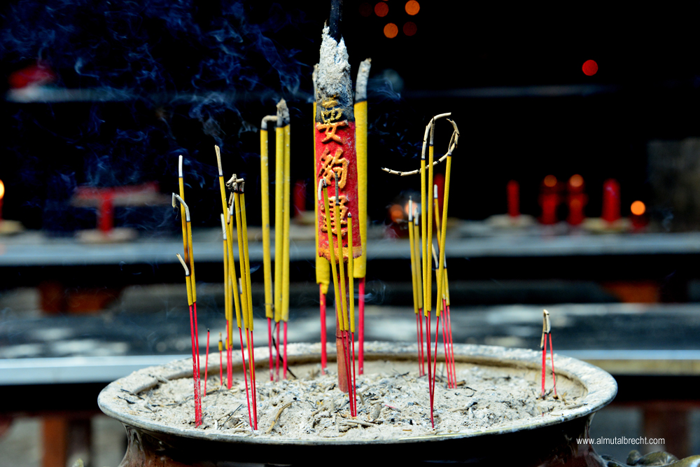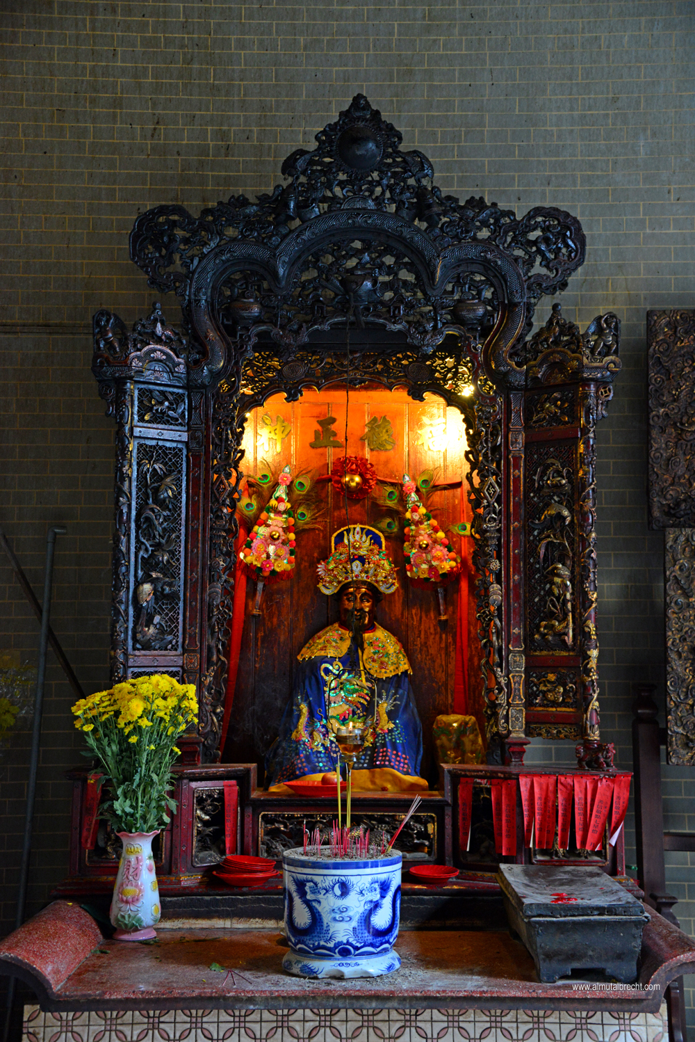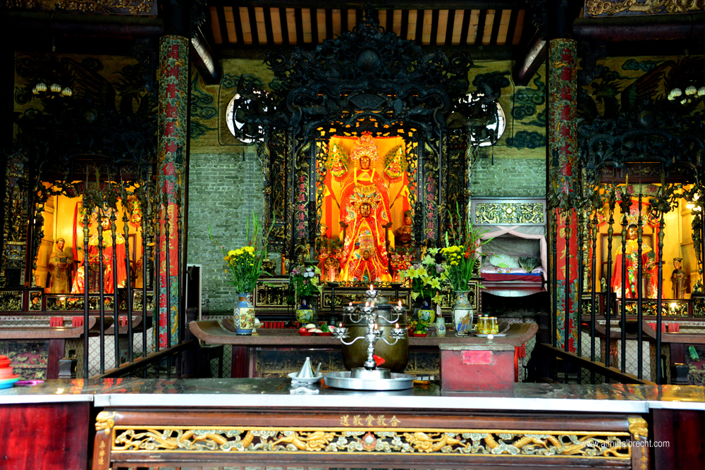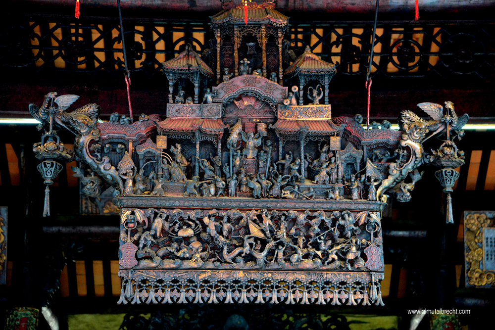 Thien Hau is a deity of traditional Chinese religion (Taoism and Buddhism). The Temple – also called Hoi-Quan-Tue-Tanh – is located on the Nguyen Trai Street in Cholon (district 5) in Ho Chi Minh City. The roof is decorated with small porcelain figurines. The interior of the pagoda is a partially covered courtyard. Inside there is the altar of Thien Hau, incense burners and spirals. When Cantonese immigrants established the temple towards the middle of the nineteenth century, they named the pagoda after Thien Hau, also the Goddess of Seafarers. New arrivals from China would have hastened here to express their gratitude for a safe passage accross the South China Sea.
