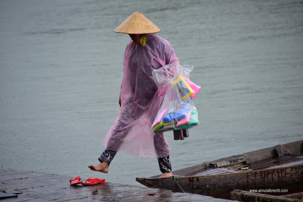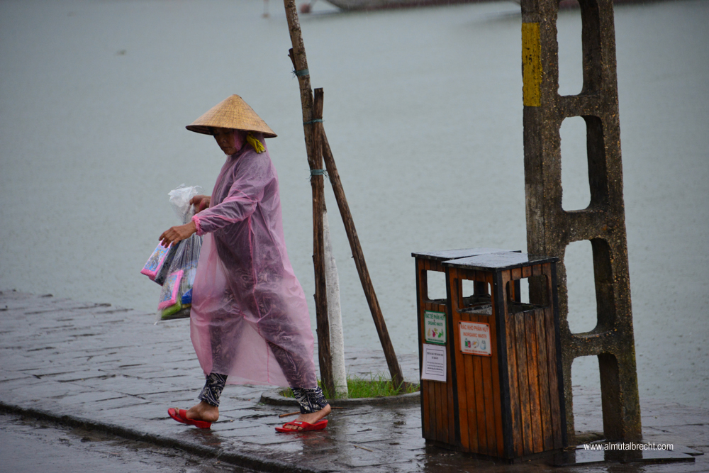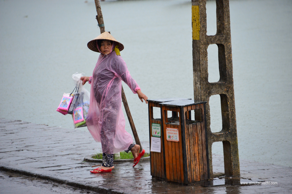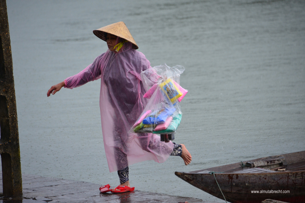Vietnamese woman on the way to sell raincoats and umbrellas went out a little wooden boat in Hoi An.