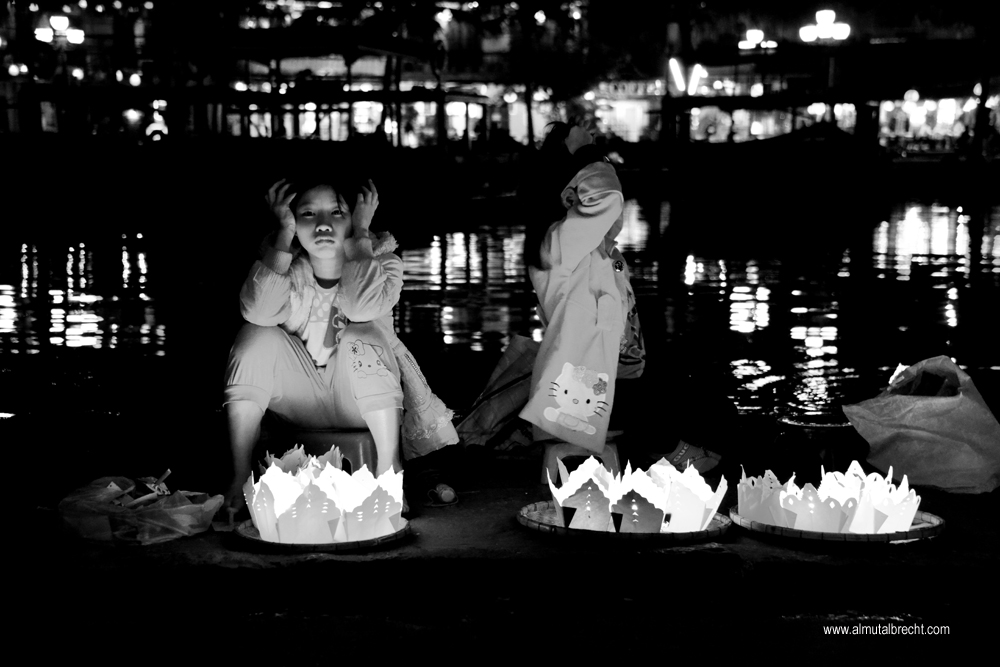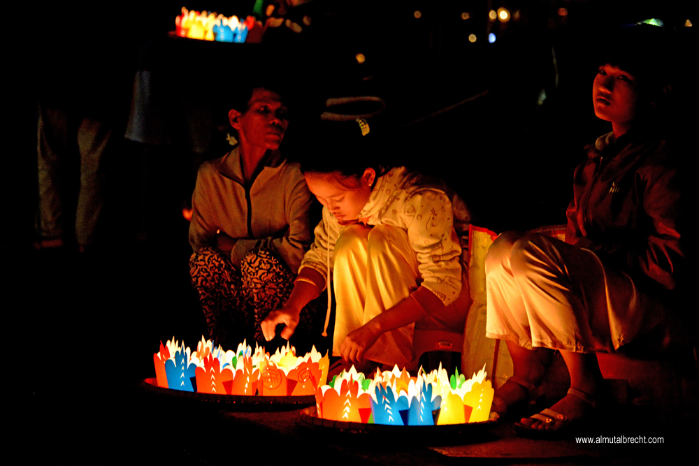 As evening encroaches and by nightfall hundreds of lanterns shine in Hoi An. At the riverbank vietnamese people sell little lanterns for setting them into the Thu Bon River.