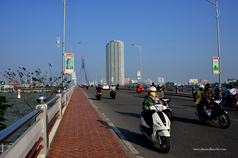motorbike drivers on the bridge in DaNang (Vietnam)