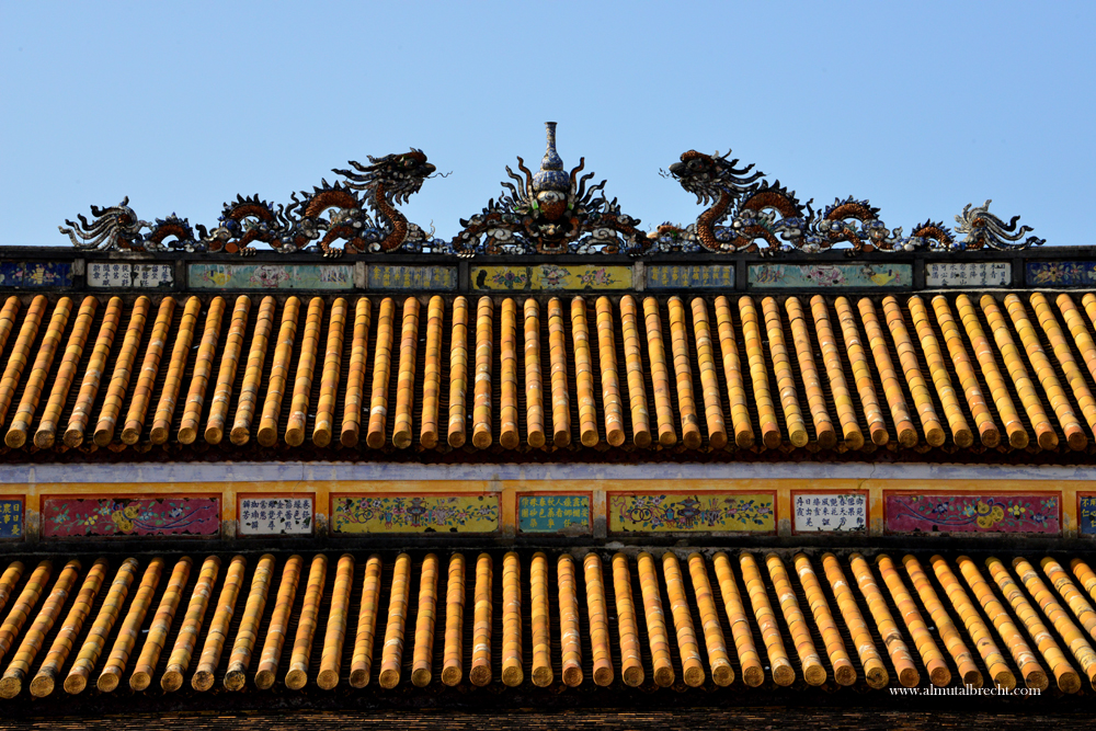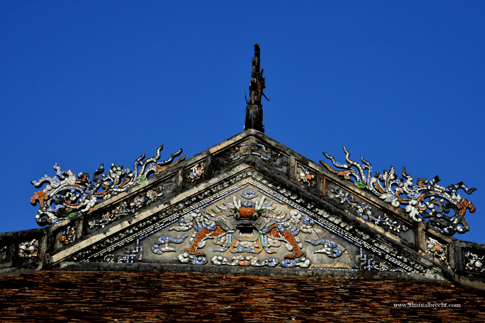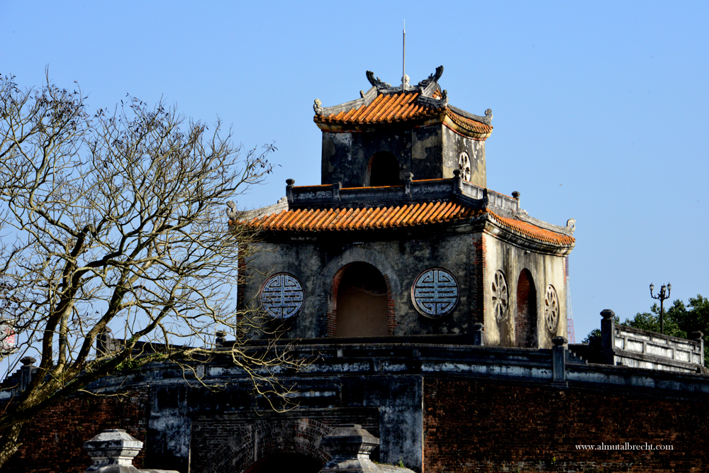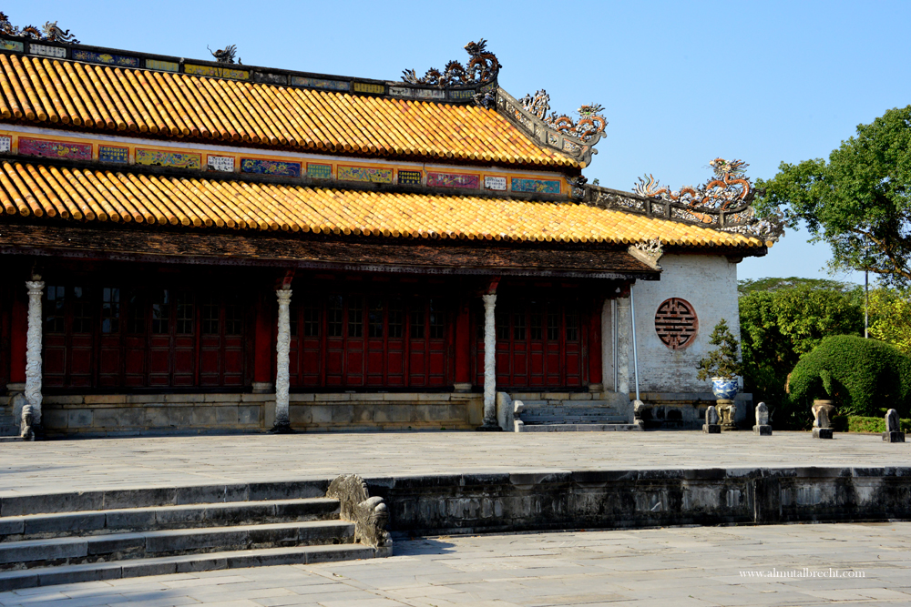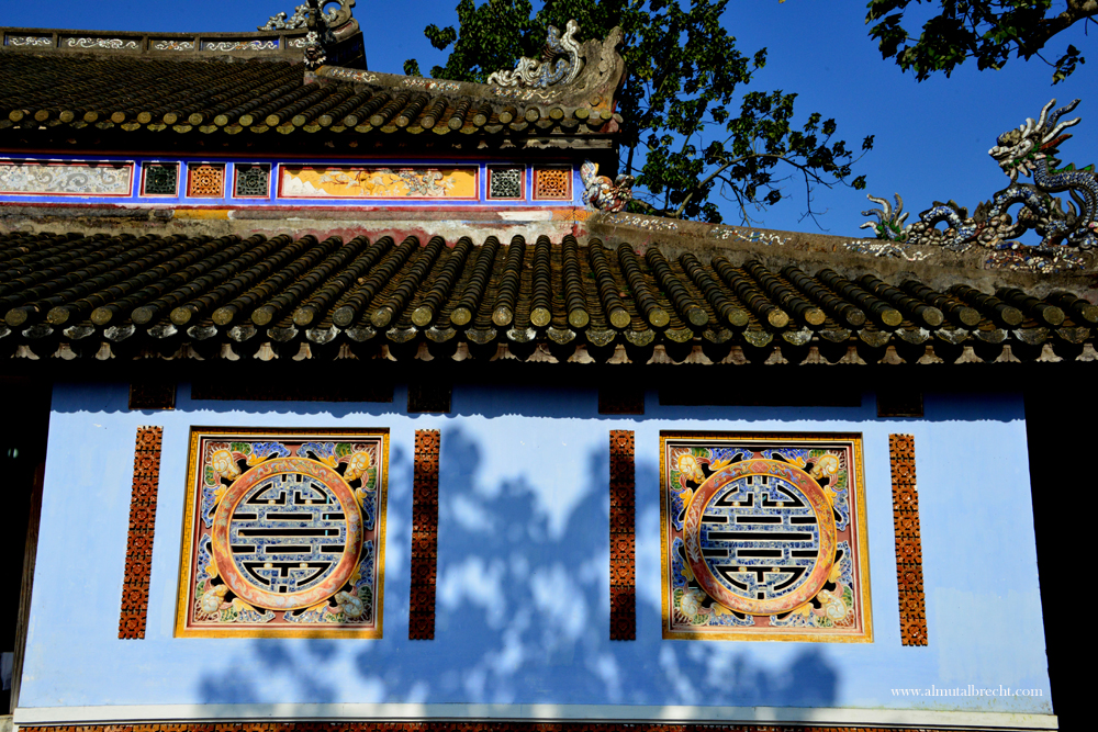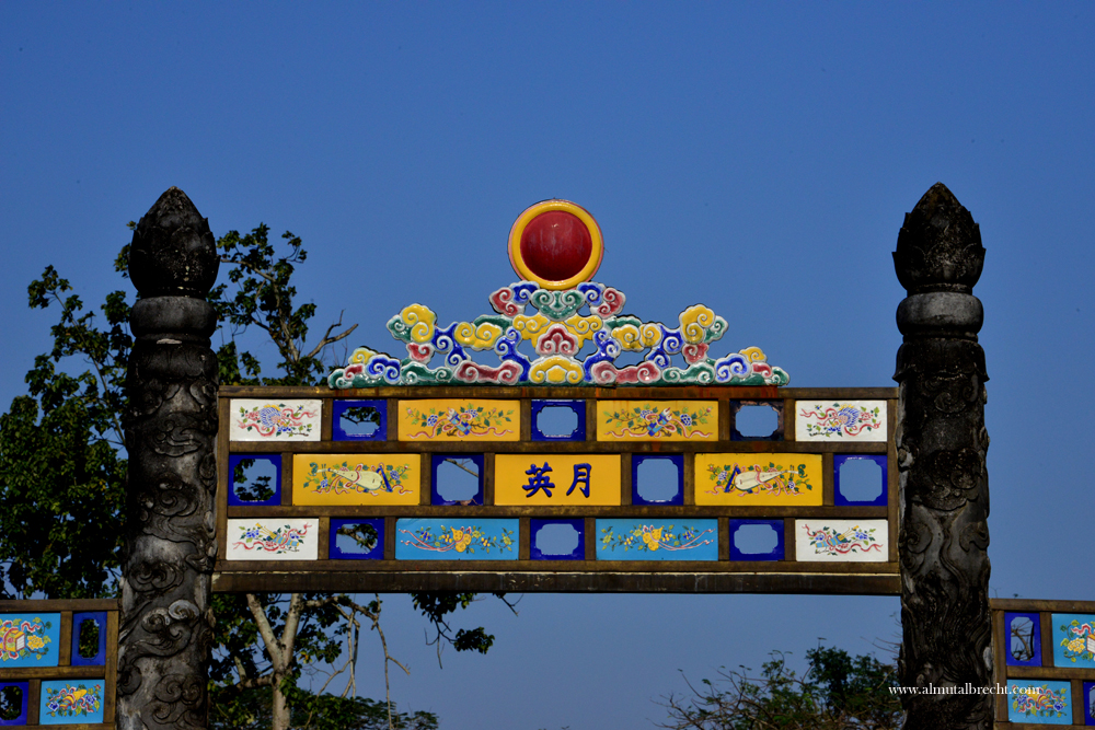 Located on the bank of the Perfume-River (Huong Giang), Hue had been recognized as one of the World Heritage Sites by UNESCO. Established as the capital of unified Vietnam in 1802, Hue was not only the political but also the cultural and religious centre under the Nguyen dynasty, the last royal dynasty of Vietnamese history from 1802 to 1945. The “Imperial City” in Hue follows the same symmetrical layout as Beijing´s “Forbidden City”. The structure of the Hue Monuments aligned cosmologically with the Five Cardinal Points (centre, west, east, north, south), the Five Elements (earth, metal, wood, water, fire) and the Five Colours (yellow, white, blue, black, red). Inside the complex are monuments, pavilions, tombs and pagodas.