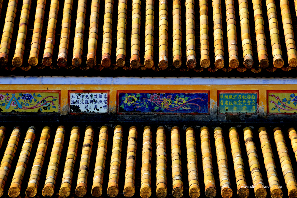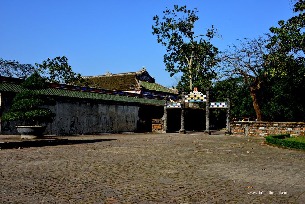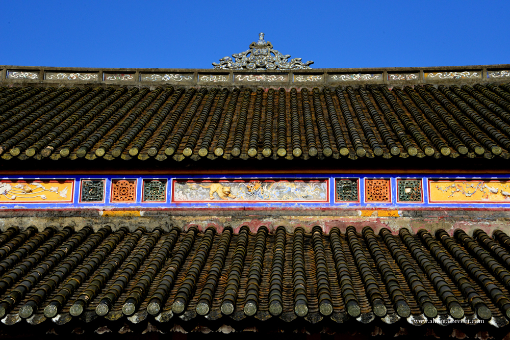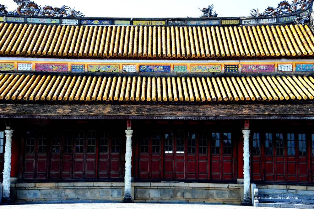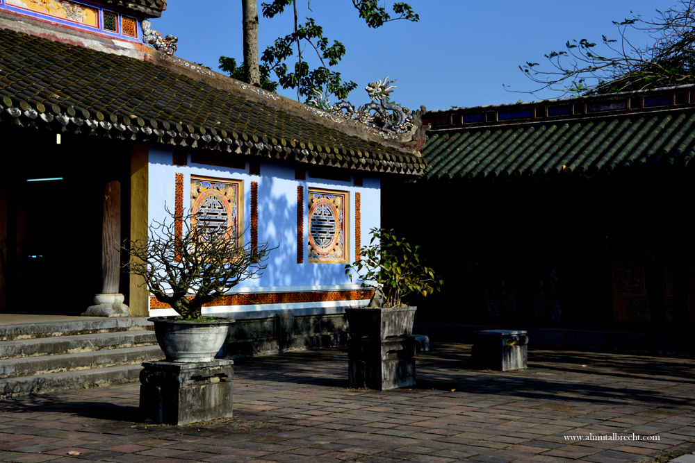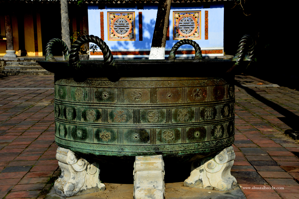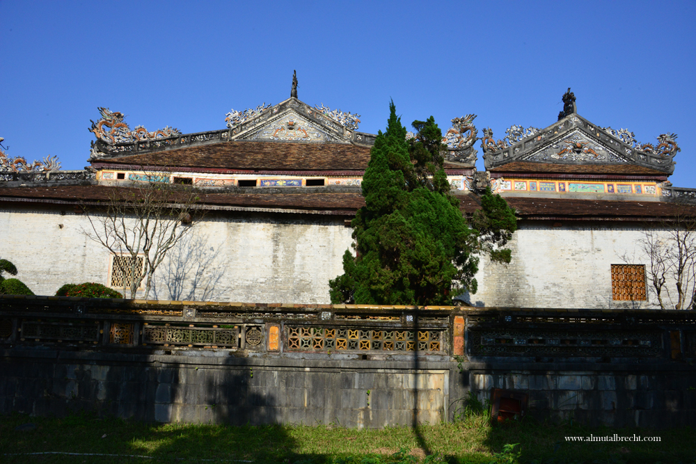 Located on the bank of the Perfume-River (Huong Giang), Hue had been recognized as one of the World Heritage Sites by UNESCO. Established as the capital of unified Vietnam in 1802, Hue was not only the political but also the cultural and religious centre under the Nguyen dynasty, the last royal dynasty of Vietnamese history from 1802 to 1945. The “Imperial City” in Hue follows the same symmetrical layout as Beijing´s “Forbidden City”. The structure of the Hue Monuments aligned cosmologically with the Five Cardinal Points (centre, west, east, north, south), the Five Elements (earth, metal, wood, water, fire) and the Five Colours (yellow, white, blue, black, red). Inside the complex are monuments, pavilions, tombs and pagodas.