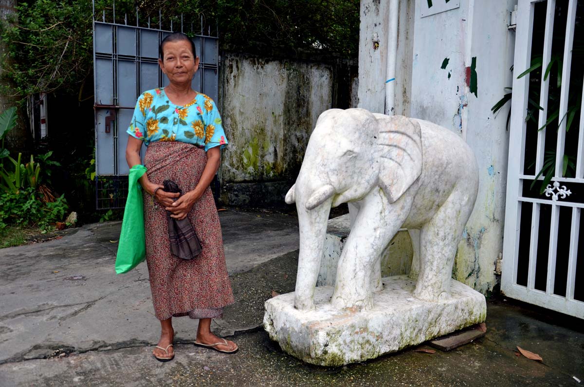 Burmese woman with white elephant, Yangon, Myanmar (Burma)