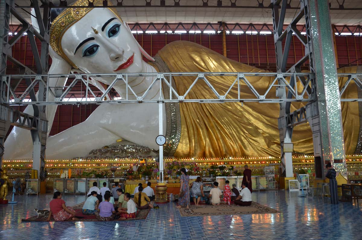 Chankhtatgyi Buddha Temple: white reclining buddha in Yangon, Myanmar (Birma)
