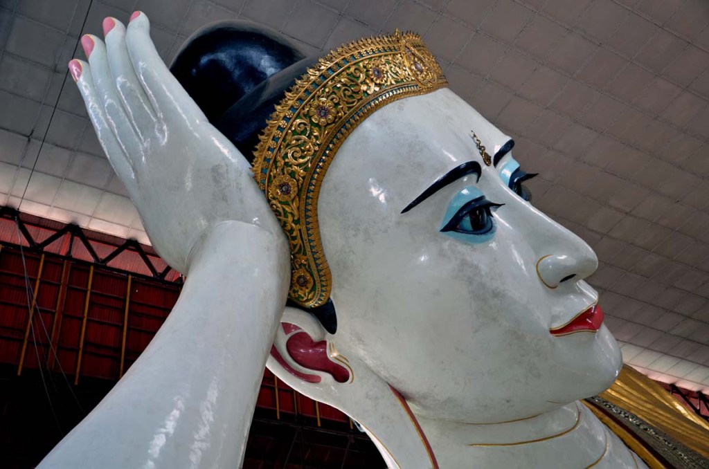 Chankhtatgyi Buddha Temple: white reclining buddha in Yangon, Myanmar (Birma)