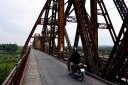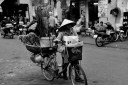 vietnamese woman on motorbike buys vegetables in the street, Hanoi
