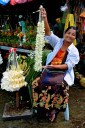 Burmese woman showing flowers for buddhist prayers at a market-place, Yagon, Myanmar (Birma, Burma)